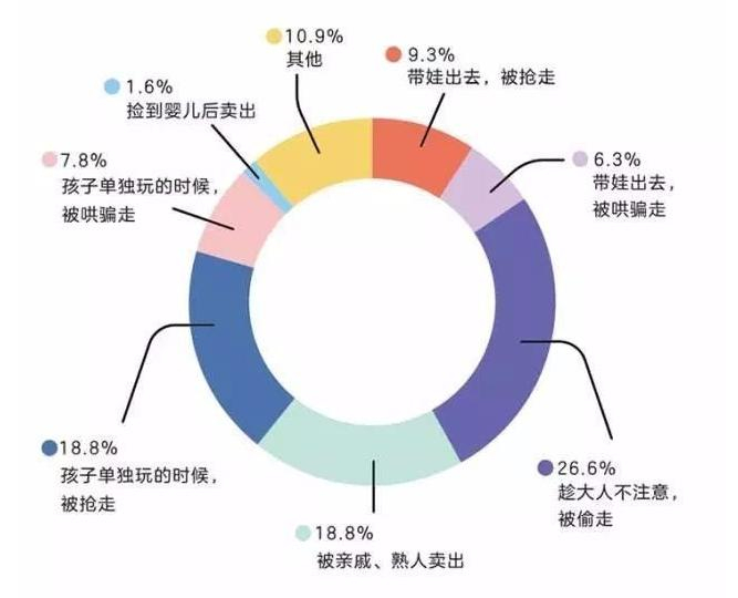 据2013年,中央人民公安大学一份基于133个被拐卖儿童的研究分析中,有这样一组抽样数据:其中,趁大人不注意被偷走的孩子占26.6%,孩子单独玩的时候被哄骗走的占7.8%。