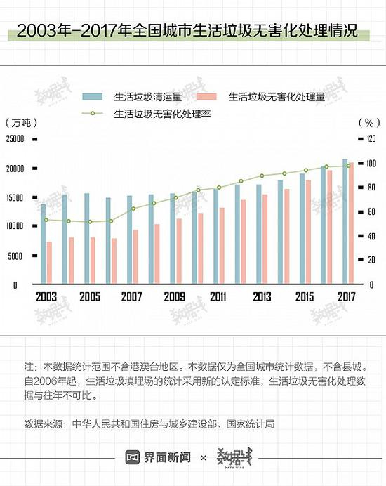 2003年以来,中国城市生活垃圾的无害化处理率逐年上升,由2003年的53.2%上升至2017年的97.7%。2017年全国产生的2.15亿吨城市生活垃圾,基本都能做到无害化处理。