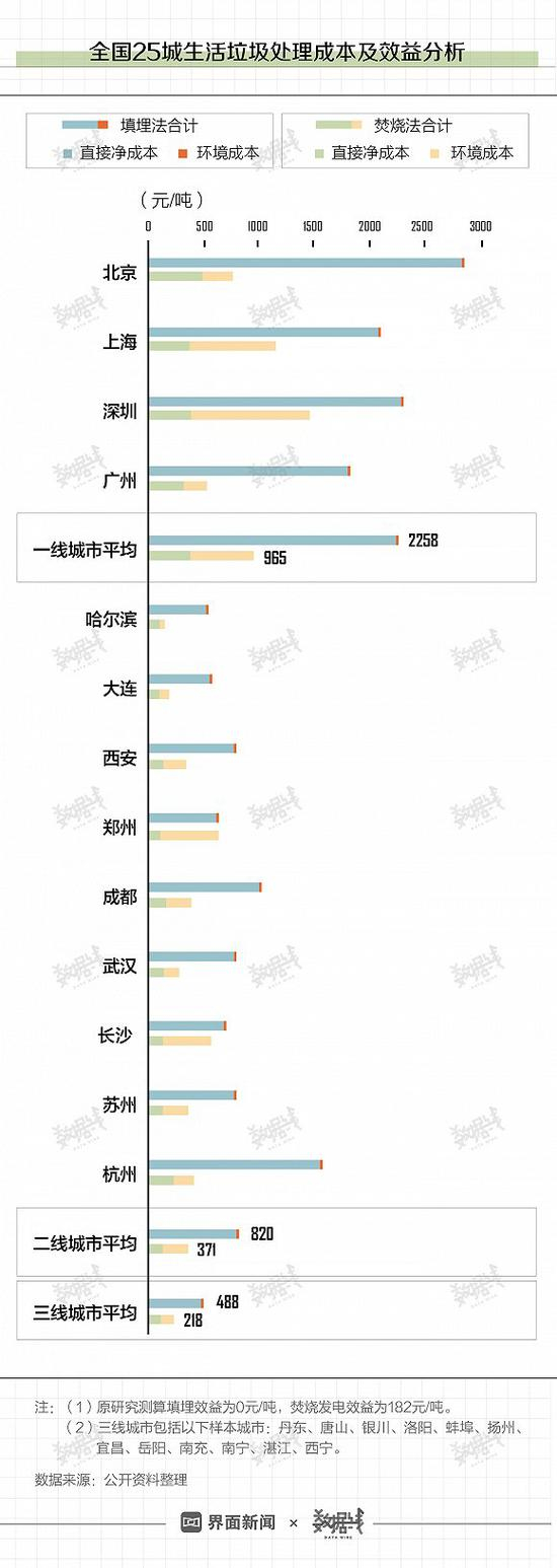 在垃圾分类逐步实施的未来,中国城市采用哪种垃圾处理方式比较合适?根据中国地质大学万君宜、冯心茹等学者对中国25座城市的综合测算,一、二、三线城市的垃圾填埋成本均明显高于焚烧处理成本,前者成本一般高出一倍左右。再考虑到焚烧发电附加的经济效益,焚烧或许是未来中国城市生活垃圾处理方式的较优选择。