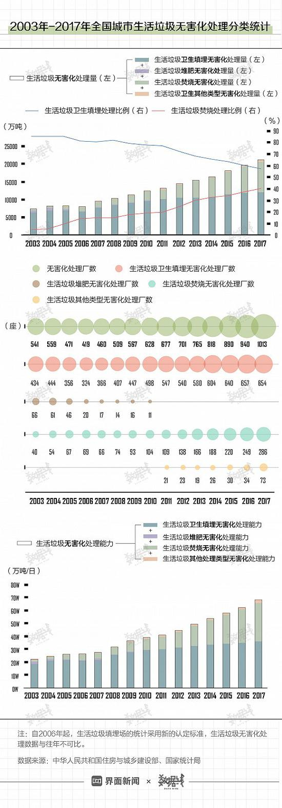 虽然填埋的垃圾占了大多数,但烧掉的垃圾也越来越多。2003年以来,中国城市生活垃圾的焚烧处理比例逐年上升,由2003年的4.6%上升至2017年的40.2%。