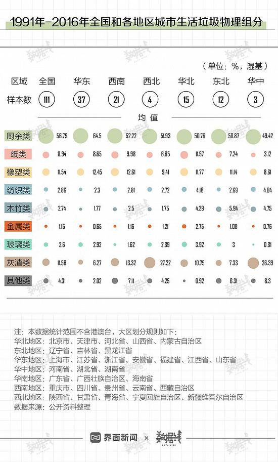 在日常城市生活中,哪种垃圾最多?根据重庆大学王小铭教授和魏潇潇等学者的分析,1991年至2016年的历史数据显示厨余类比重最大,全国层面的占比高达56.8%。具体到各大区,由于能源结构、经济水平和生活习惯的差异,各地垃圾组分比例不一,但厨余类均为占比最高的生活垃圾类型。