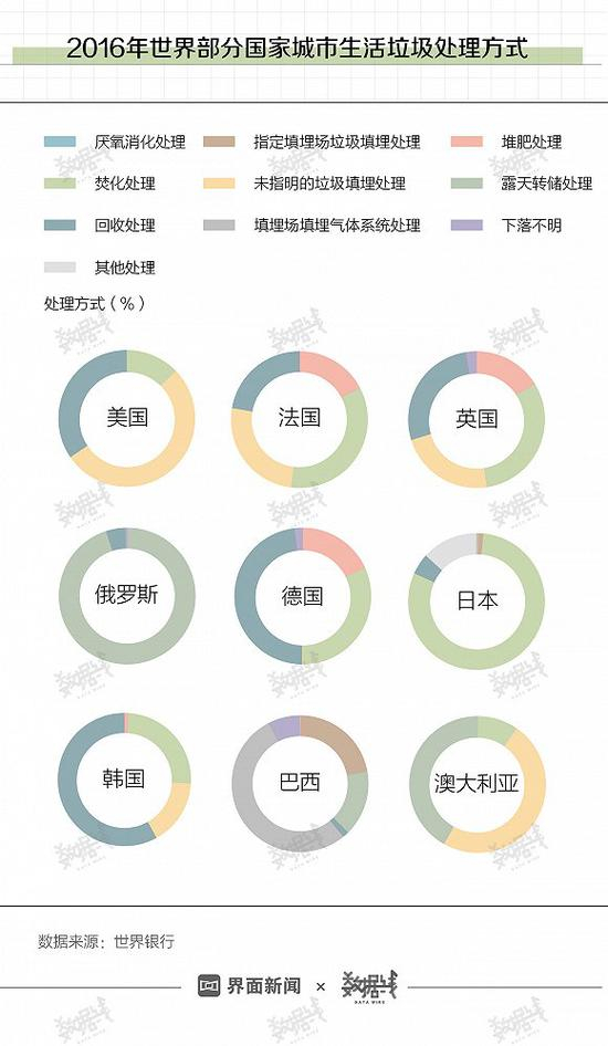 在城市生活垃圾处理方式上,各个国家的情况也不尽相同。总体而言,填埋、堆肥、焚化和回收是国际主流的垃圾处理方式。美国、法国、英国、德国等发达国家每年约有20%至50%的城市生活垃圾会被回收处理,如德国和韩国的垃圾回收处理比例即高达48%和58%。