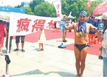 像张忠祥一样开心的还有外号叫“疯得扳”的李立。在江汉区方阵中,光着上身赤着脚的李立还是那副熟悉的标配——手上拿着写有“疯得扳”三个字的横幅,脖子上挂满各种颜色的奖牌。这是记者在釆访汉马、水马、渡江以来第三次和“疯得扳”李立见面了。