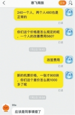 “7月2日,由于我个人的原因要把9月5日的机票改签到8月29日,我就打电话给俄罗斯航空公司的工作人员,对方告诉我两张机票的改签费和差价一共约为12100卢布,折合人民币1200多元。但是新飞之旅航空服务有限公司客服却告知我是4240元(一张机票的差价1560元,改签费560元),当时我就傻眼了,怎么可能差别这么大?我提出了质疑后,客服马上改口说是搞错了,重新核实后会回填改签结果。”许女士告诉记者,修改后的费用依然让她难以接受,“新飞之旅航空服务有限公司那边第二次给的结果是,一张机票的差价950元,改签费240元,也就是两张机票的改签费和差价一共是2380元,比我两张机票的价格还要贵。”