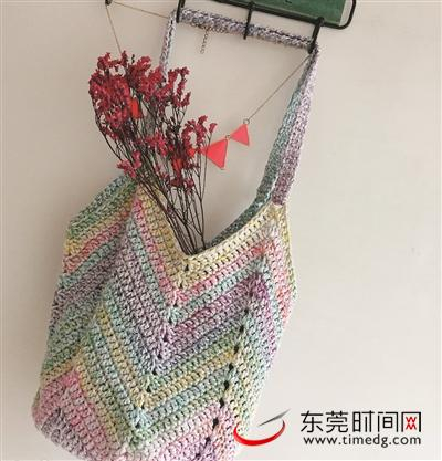 有一次,王素梅看到一款某品牌包包,感觉特别喜欢,但是高昂的价格让她望而却步。她想,这款包包是编织款,何不自己钩编一个?于是,她找来同款的毛线,研究针法,利用碎片时间,5个小时下来,一个“同款”包包就新鲜出炉了!