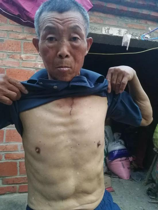 病历显示,董国明2009年12月10日在蚌埠医学院附属医院做了右下肺叶根治性切除术,他的前胸至今还能看到刀口的伤疤。“是个大手术,身上开了很大的口子。”董国明说。
