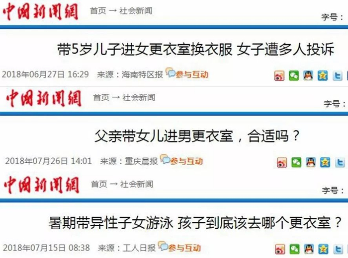 除了该不该和异性儿童亲嘴,另一个与儿童有关的性别话题也常常被提起,那就是“该不该让儿童进异性更衣室”。