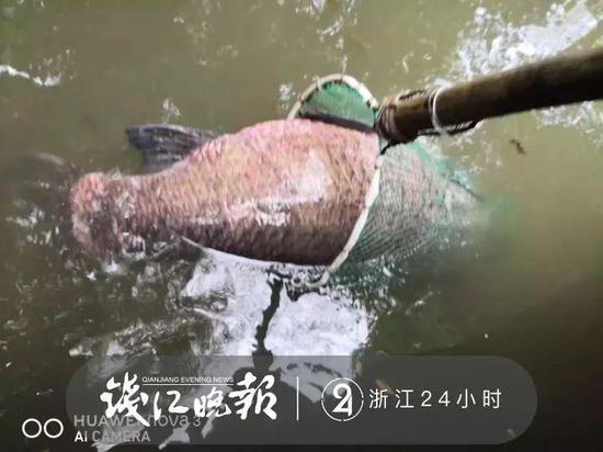 这条鱼是今天凌晨西湖捕鱼队的师傅们在涌金门附近捕捞到的。
