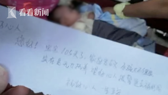 在婴儿用品中,目击群众还发现一张纸条,上面写着:“好心人您好,宝宝105天了,家庭变故,小孩子不健康,实在无力抚养,希望好心人报警送去福利院,祝好心人一生平安”。