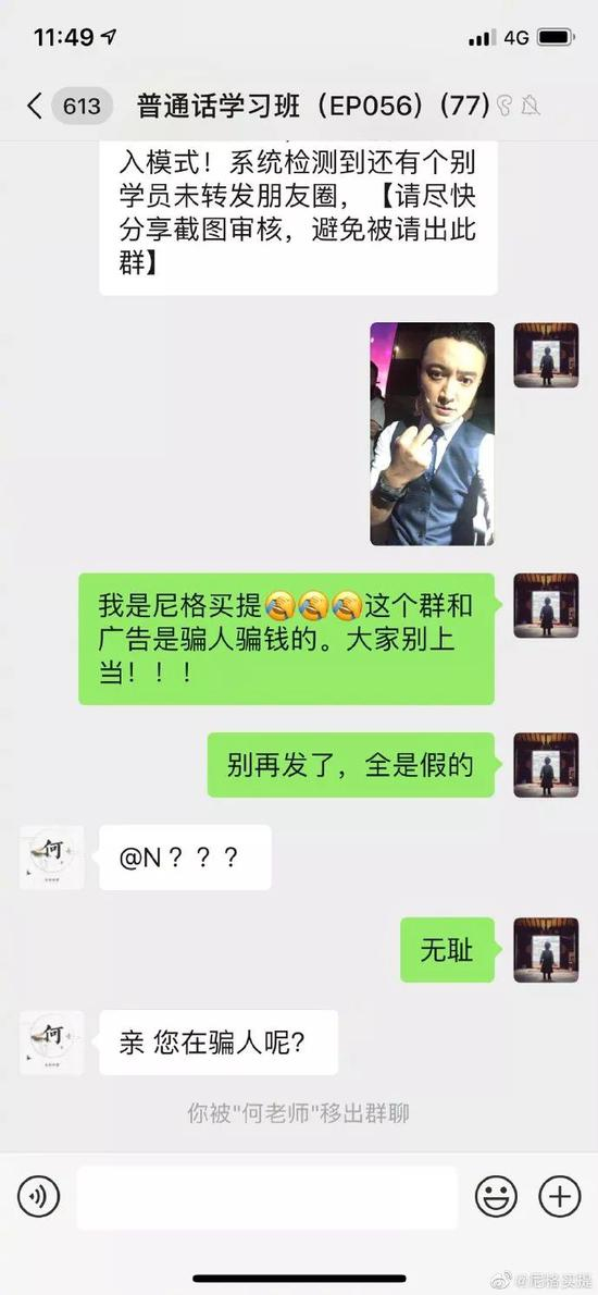 “央视著名节目主持人‘主办’的免费在线语言学习班”,看到这样的广告,你会相信吗?近日,央视主持人尼格买提在微博曝光了一组他入群打假却被踢出群聊的截图,立刻上了微博热搜。
