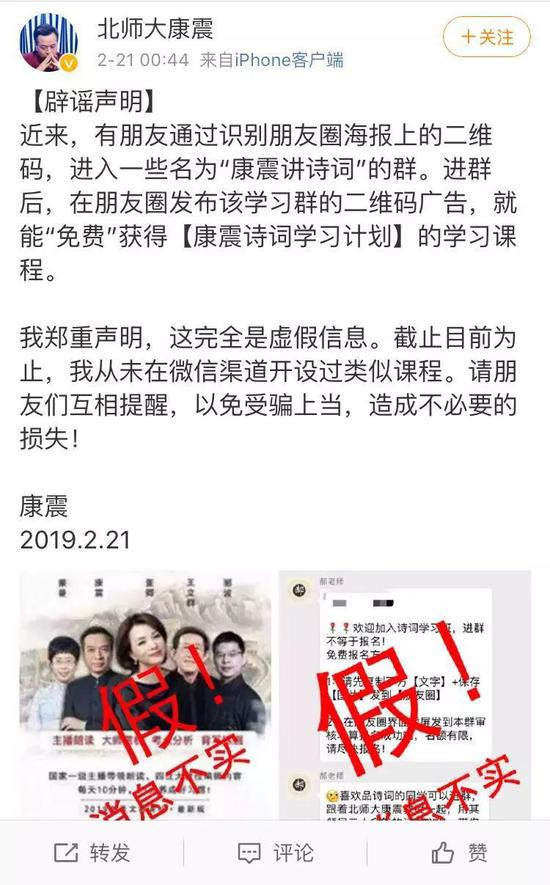 第一次是在2月21日,康震表示:“近来,有朋友通过识别朋友圈海报上的二维码,进入一些名为‘康震讲诗词’的群。进群后,在朋友圈发布该学习群的二维码广告,就能‘免费’获得[康震诗词学习计划]的学习课程。我郑重声明,这完全是虚假信息。截止目前为止,我从未在微信渠道开设过类似课程。请朋友们互相提醒,以免受骗上当造成不必要的损失!”
