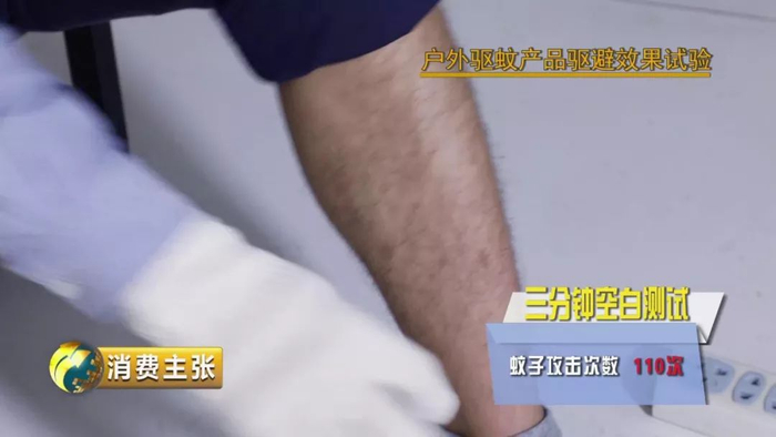 实验人员首先进行不带任何驱蚊产品的空白实验,三分钟后左腿遭受攻击的次数是110次。