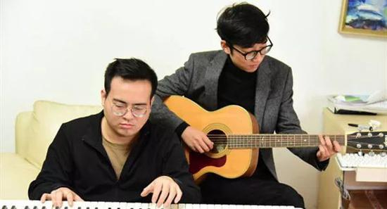 △高至凡老师(左)和他的音乐老搭档徐聪。2014年,高至凡从厦门大学音乐系毕业后,来到厦门六中当一名音乐教师。
