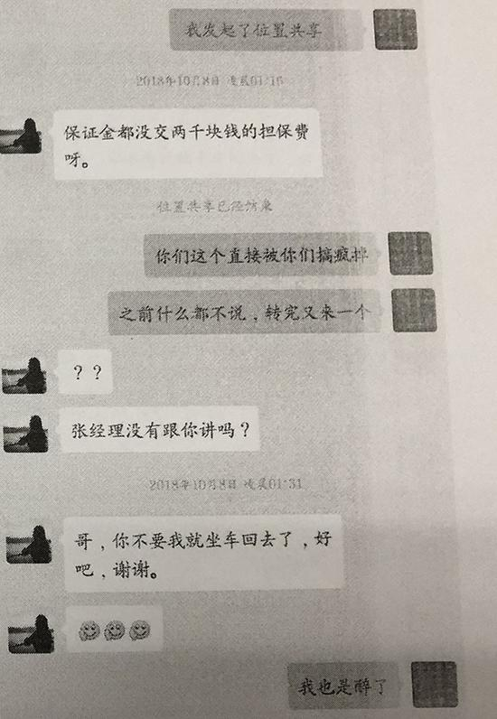 嫌疑人向男顾客实施诈骗时的微信聊天记录截图 来源:澎湃新闻记者 卫佳铭 摄