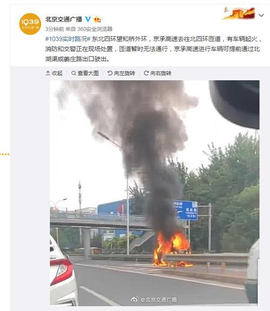 突发 京承高速去往北四环匝道有车辆起火