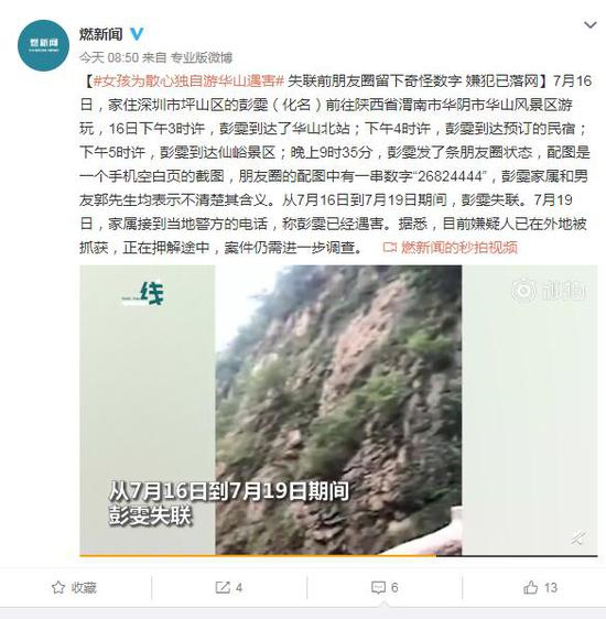 [失联前朋友圈留下奇怪数字 嫌犯已落网]7月16日,家住深圳市坪山区的彭雯(化名)前往陕西省渭南市华阴市华山风景区游玩,16日下午3时许,彭雯到达了华山北站;下午4时许,彭雯到达预订的民宿;下午5时许,彭雯到达仙峪景区;晚上9时35分,彭雯发了条朋友圈状态,配图是一个手机空白页的截图,朋友圈的配图中有一串数字“26824444”,彭雯家属和男友郭先生均表示不清楚其含义。从7月16日到7月19日期间,彭雯失联。7月19日,家属接到当地警方的电话,称彭雯已经遇害。据悉,目前嫌疑人已在外地被抓获,正在押解途中,案件仍需进一步调查。