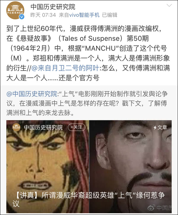 “如果‘傅满洲’系列是‘黄祸论’论调下西方对旧中国的偏见,今天利用‘尚气’来圈钱则是西方不能正确承认错误又企图蒙混过关的傲慢。”