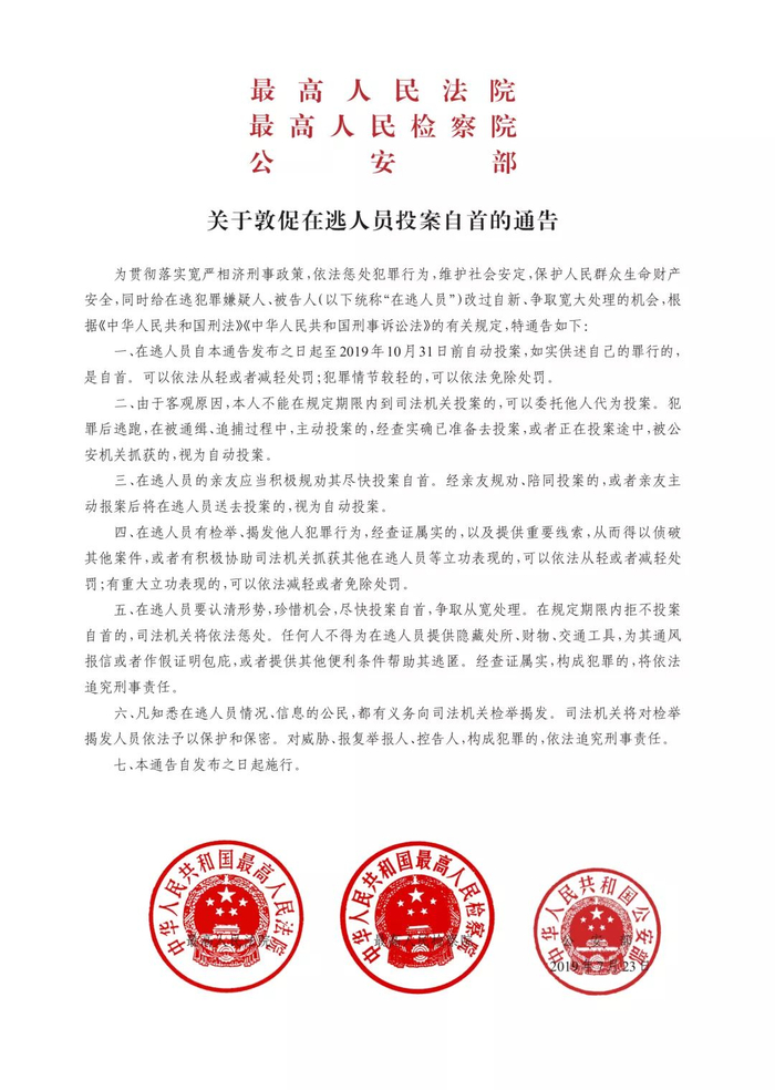 人民日报政文记者从公安部新闻发布会上获悉:公安部今天首次以发布会的方式,发布A级通缉令,公开通缉50名重大在逃人员。同时,昨天最高人民法院、最高人民检察院、公安部联合印发了《关于敦促在逃人员投案自首的通告》,也在今天对外公布。