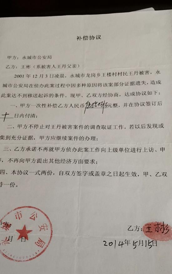 协议称,永城市公安局(甲方)一次性补偿王彬(乙方)58万元,协议签订后10日内付清,并不停止对王小丹被害案件的调查取证工作,若以后发现或收集到充分证据,应继续案件办理。