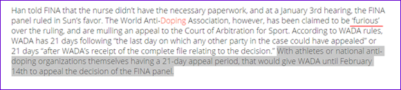 最有意思的是,按照美国专业游泳网站swimswam对WADA裁决反馈的分析,FINA的裁决激怒了WADA: