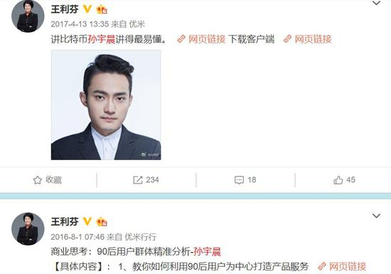 在湖畔大学,孙宇晨还与商战真人秀节目《赢在中国》制片人、优米网创始人王利芬成为朋友和合作伙伴。身份之外,王利芬最出名的事件,是去年1月她就创业者茅侃侃的离世写了篇“10万加”爆款文章,并在微博上庆功。