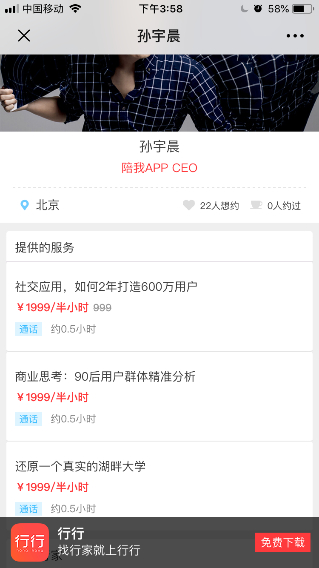 王利芬还邀请孙宇晨上优米网讲授虚拟币等商业课程,为创业者解疑答惑,解答的单价都不便宜——半个小时1999元,22个想花2000元约他聊人生的网友里,没有一个付诸实践。