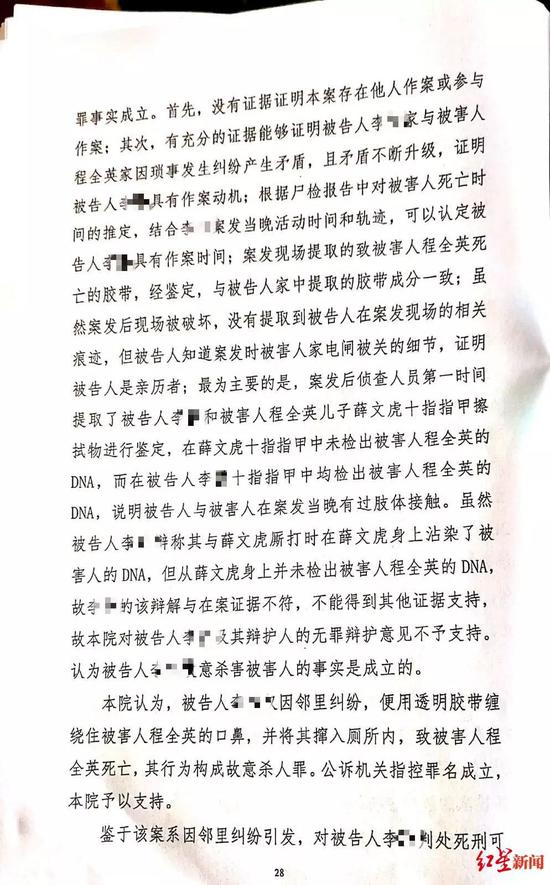 “最为主要的是,案发后侦查人员第一时间提取了李朋和薛文虎十指指甲擦拭物进行鉴定。在薛文虎指甲中未检出被害人程全英的DNA,而在李朋十指指甲中均检出程全英的DNA。说明两人当晚有过肢体接触。”判决书中称。