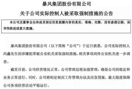 7月28日晚,暴风集团发布一则公告称,公司实际控制人冯鑫因涉嫌犯罪,被公安机关采取强制措施。不过,具体原因并没有公布,公司称“相关事项尚待公安机关进一步调查”。