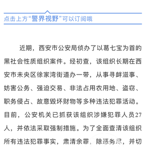 7月29日,西安警方通报称,西安市公安局侦办了以葛七宝为首的黑社会性质组织案件。经初查,该组织长期在西安市未央区徐家湾街道办一带,从事寻衅滋事、妨害公务、强迫交易、非法占用农用地、盗窃、职务侵占、故意毁坏财物等多种违法犯罪活动。目前,公安机关已抓获该组织涉嫌犯罪人员27人,并依法采取强制措施。为了全面查清该组织所有违法犯罪事实,肃清余罪,除恶务尽,并切断其非法利益链条,现面向全社会公开征集该黑社会性质组织的违法犯罪线索。