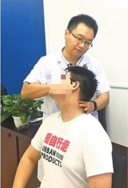 该科副主任曹必伟检查发现王先生的颈部斜方肌和肩胛提肌特别僵硬,局部按压时痛感非常明显,颈项部两侧肌肉不平衡、不对称,颈前屈、后伸、旋转都受限,是典型的落枕症状。曹必伟给王先生进行了推拿(如图),以行气活血、缓急止痛,再配合热敷、微波和津波等物理因子治疗,王先生的症状缓解。
