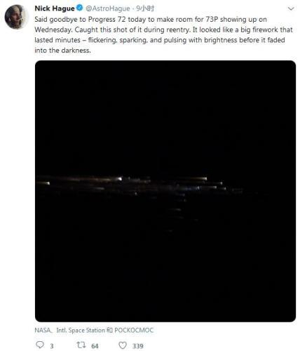 国际空间站宇航员拍下飞船焚毁情形:像大型烟火