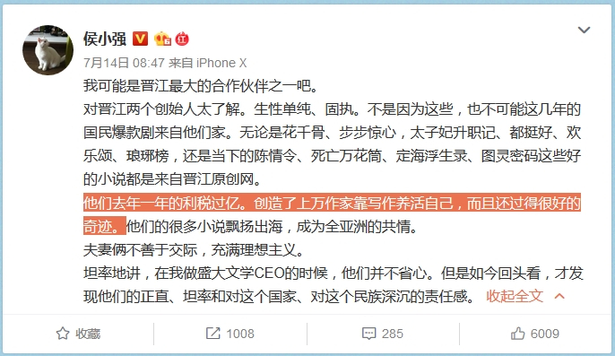 此前,7月14日,中汇影视创始人、金影科技创始人侯小强发微博称,这几年的国民爆款剧如《花千骨》、《步步惊心》、《陈情令》等来自晋江,他们去年的利税过亿,创造了上万作家靠写作养活自己,而且还过得很好的奇迹。