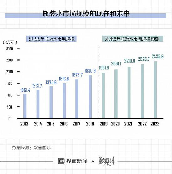 欧睿国际提供的数据显示,中国瓶装水市场规模从2013年的1061.4亿元规模增长至2018年的1830.9亿元,预计到2023年这一规模将增长至2435.6亿元。