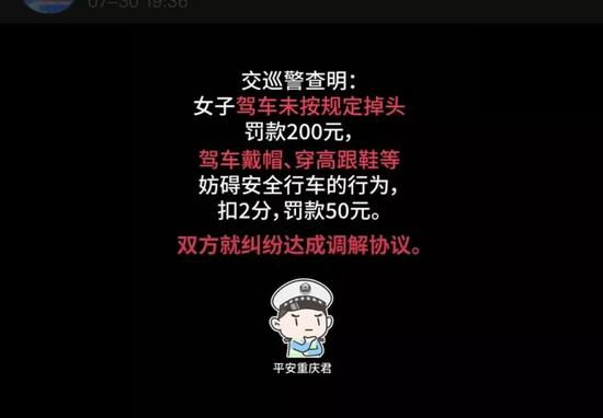 对于女车主的行为,@平安重庆 解释:交巡警查明,女子驾车未按规定掉头,罚款200元。驾车戴帽、穿高跟鞋等妨碍安全行车的行为,扣2分,罚款50元。