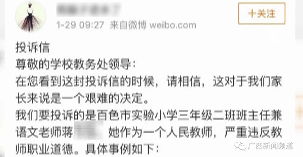 今年1月28日,微博上有网友报料称:百色市实验小学三年级二班班主任兼语文老师蒋某,在得知班上一学生的家长在殡仪馆工作后,提出希望家长更换工作;后又以“看到你女儿就会害怕”为由,要求家长给孩子换班;此要求被拒绝后,蒋某则要求全班同学不得与该学生说话,试图孤立该学生。29日,数名家长又通过朋友圈发长文投诉,蒋某还有多种违反师德的行为,例如私下向家长售卖红糖,并承诺只要家长购买红糖就可替孩子换一块“免罚金牌”;此外,这名老师还在家长群内发表带有威胁语气的内容,说“你骂我,我是大人,心理承受得住。但我骂你小孩,就怕他是小孩,受不住”。报料内容在网上流传后,引发众多网友和家长们的关注。