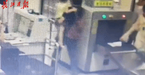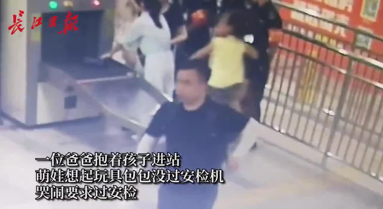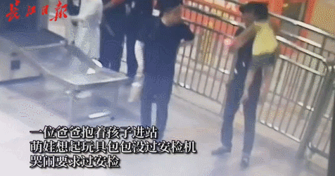 可能看到爸爸的包过了安检而自己的“包”没过安检小姑娘不干了在爸爸身上哭闹不止不停指向安检机▼