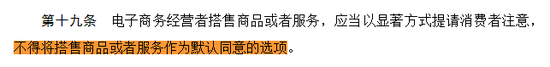 《中华人民共和国电子商务法》第十九条规定,电子商务经营者搭售商品或者服务,应当以显著方式提请消费者注意,不得将搭售商品或者服务作为默认同意的选项。