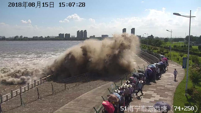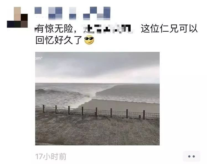 朱先生几人是海宁本地人,对这里的潮水比较熟悉,见到潮水的这个仗势,他们就爬到上面一层海塘去避潮了。可是突然间,朱先生远远看到,下面一层海塘上居然还有4个人。由于距离有点远,还没来得及等他把那些人喊上塘,第二波潮水就到了,而且威力比第一波大很多。