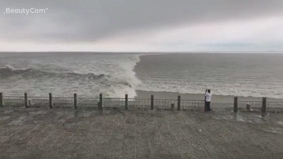 据了解,昨天看潮的人非常多,从远处看,大家都以为潮水不会很大,却没想到巨浪突然直接扑上了海塘。