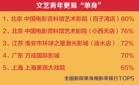 虽然全国95后“单身”观影率不足3成,但很多影院因为地理位置、运营策略等综合因素,在这一指标上远超平均指标,全国“单身”观影率超过50%的影院将近200家,其中TOP5影院的“单身”观影率均在7成以上。以放映艺术电影著称的中国电影资料馆艺术影院,在北京有两家影城,这两家以80%左右的“单身”观影率冠绝全国。
