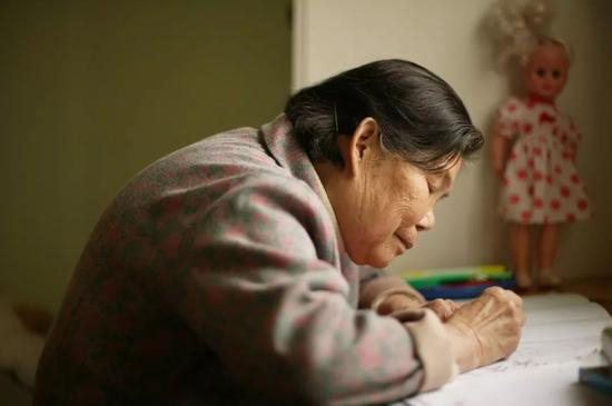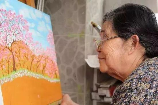 由于腿脚不便上下楼梯,奶奶极少出门,她常常趁着光线好时来到阳台作画,最长的一幅画画了一个月之久。在画画的时光里,奶奶将情感倾注进色彩,将回忆勾勒成线条。