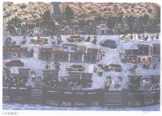 梵高奶奶在作画时也十分有爱。她把城市比作钢筋水泥的森林,因此画了一幅《水泥森林》,与平时鲜艳的色调不同,这幅画色调灰暗,楼房、汽车、行人机械地排列着。这或许也是梵高奶奶不愿走出农村的原因。