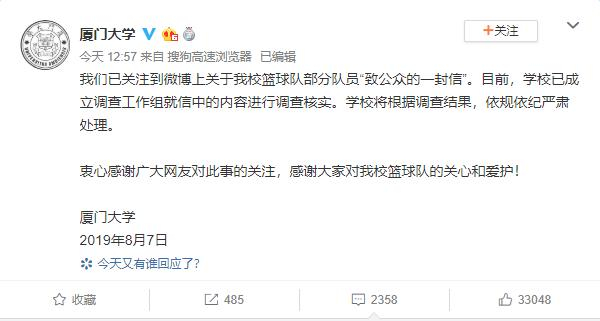 尽管林晨耀随后作出了回应,称自己“身正不怕影子斜”,但针对球员提出的大部分指控,林晨耀并未做出解释。8月7日中午,厦门大学表示已经成立调查工作组进行核实,学校将根据调查结果,依规依纪严肃处理。