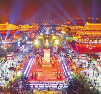 上世纪90年代末,西安市政府拟建曲江旅游景区,由著名工程院院士张锦秋大师规划设计曲江核心区“七园一城一塔”布局,其中“一塔”就是大雁塔,“一城”就是大唐不夜城。2009年,大唐不夜城建成运营,一条现代化的“盛唐天街”展现在世人眼前。
