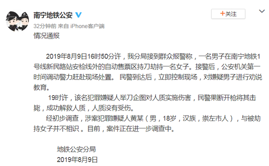 2019年8月9日16时50分许,我分局接到群众报警称,一名男子在南宁地铁1号线新民路站安检线外的自动售票区持刀劫持一名女子。接警后,公安机关第一时间调动警力赶赴现场处置。 民警到达后,立即控制现场,对嫌疑男子进行劝说教育。