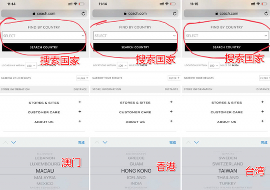 此前,有媒体在Coach官网上搜索门店时发现,其显示为find by country(注:百度翻译为“按国家查找”),在下拉栏中赫然显示着香港,澳门和台湾三个地名,并与中国和美国等国家并列。