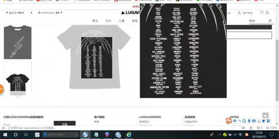 北青报记者注意到,同样的问题也出现了轻奢品牌纪梵希的T恤上。在纪梵希的一款黑色闪电T恤中,背面的图案同样也是印有多个城市和国家名称,其中北京、成都、杭州等中国城市后面都跟有中国,然而在香港和台北分别独立一个版块,分别是HongKong和Taiwan,与法国、意大利、中国、美国等国家名称并列。