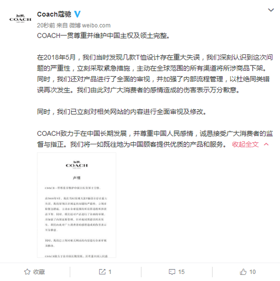 8月12日中午,蔻驰官方官微和外网同发道歉并发表声明表示“一贯尊重并维护中国主权和领土完整”。道歉信中,蔻驰称,“在2018年5月,我们当时发现几款T恤设计存在重大失误,我们深刻认识到这次问题的严重性,立刻采取紧急措施,主动在全球范围的所有渠道将所涉商品下架。”蔻驰表示,同时,还对产品进行了全面的审视,并加强了内部流程管理,以杜绝同类错误再次发生。并由此对广大消费者的感情造成的伤害表示万分歉意。