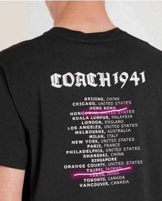 根据网传图片,该款T恤为Coach与迪士尼联合款,在T恤背面印有多个城市和国家名称,其中北京和上海后面都跟有中国,然而在香港和澳门则独立一个版块,并未在其后加上中国(China)字样,而在台北(taipei)后面则直接加上了台湾(taiwan),与加拿大,中国,美国等国家名称并列。