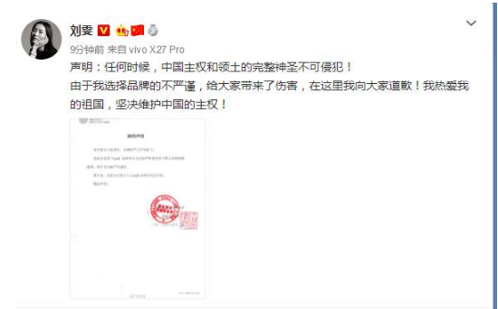 蔻驰的最新代言人“大表姐”刘雯更是在微博上发出声明表示“中国主权不可侵犯”,其表示将与蔻驰解约,同时刘雯还向大家做出了道歉。刘雯称,任何时候,中国主权和领土的完整神圣不可侵犯!“由于我选择品牌的不严谨,给大家带来了伤害,在这里我向大家道歉!我热爱我的祖国,坚决维护中国的主权!”